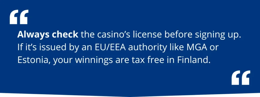 One of the greatest benefits for Finnish players is the possibility of tax free casino earnings, provided the casino has an EU or EEA license. Winnings from gaming operations located in these areas are free from personal income tax in Finland, per tax legislation.