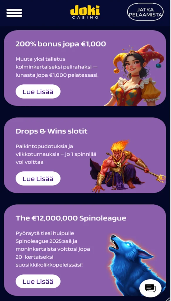 Joki Casino tarjoaa 200 % ensitalletusbonukset jopa 1000 € asti. Bonukseen on kytketty 35x kierrätysvaatimus, joka koskee sekä talletusta että bonusta. Kierrätysaika on 10 vuorokautta, joka kohtuullistaa muuten tiukahkoja kierrätysehtohja.