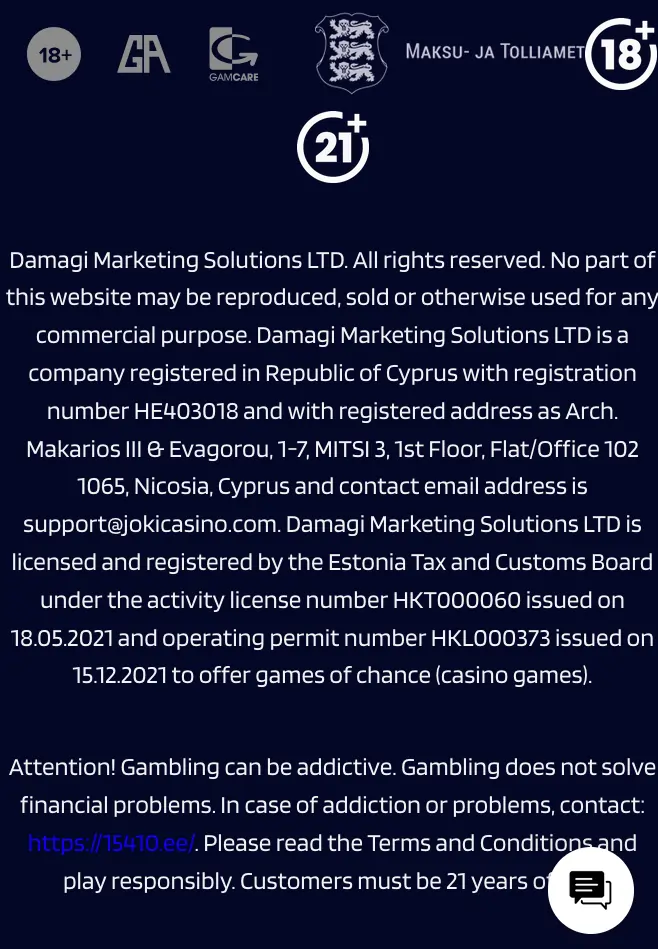 Joki Casino toimii Viron vero- ja tullihallituksen myöntämällä laillisella pelilisenssillä (numerolla HKL000373), mikä takaa kasinon toiminnan lainmukaisuuden ja alan säädösten noudattamisen. Viron lisenssi on yksi Euroopan arvostetuimmista ja tiukimmin valvotuista pelilisensseistä, joka edellyttää muun muassa vakavaraisuutta, pelaajien rahojen erilliskäsittelyä sekä reilun pelin takeita. Virolaiset nettikasinot tarjovat suomalaisille verovapaat voitot, samoin kuin MGA kasinot.