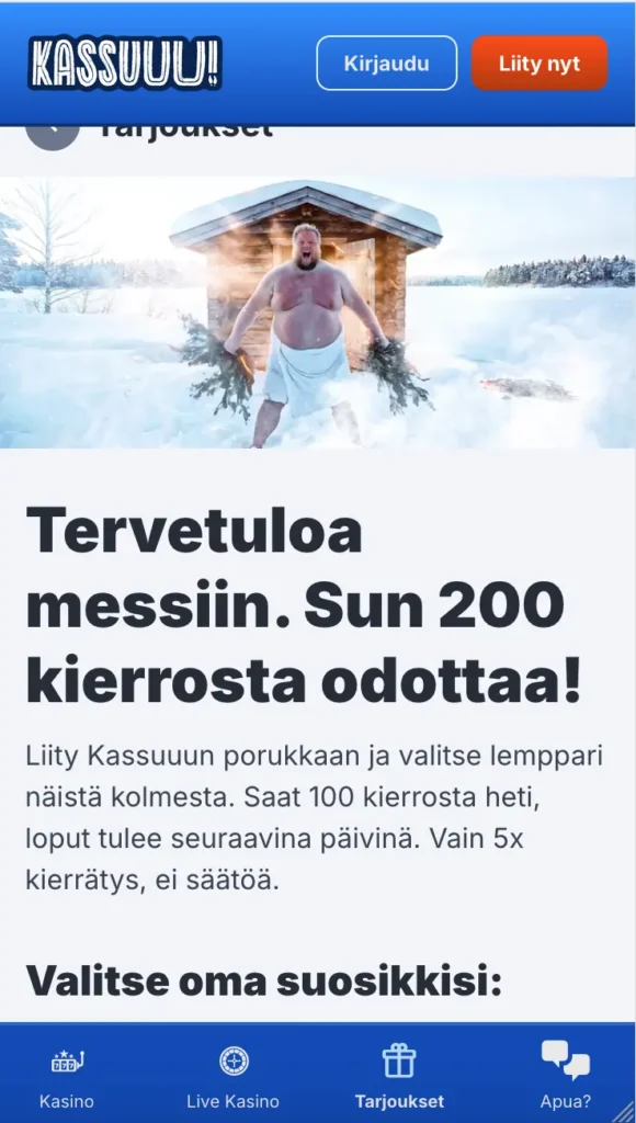 Kassuuu Casino eroaa monista muista suomalaisille markkinoille suunnatuista pikakasinoista edukseen, sillä tämä kasino ilman rekisteröitymistä on ainakin viimeisen päälle Suomilokalisoitu kotimaista saunahuumoria myöten. Kaikesta näkee, että taustalla on suomalaista osaamista, joten rehti suomalainen nettikasino on kyseessä. Tervetuliaisbonus on kiinnostava vain 5x kierrätyksen takia.