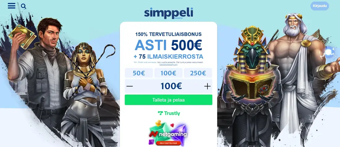 Mikäli haluat tukea suomalaista yrittämistä, Simppeli kasino voi olla loistava vaihtoehto. Laaja pelivalikoima ja monipuoliset bonukset pitävät huolen siitä, että kasinolla voi viihtyä pidempäänkin. Jos olet etsimässä tuntuvaa ensitalletusbonusta, tämä kasino sopii varmasti juuri sinulle. Bonuksen voi lunastaa verkkopankkitunnusten avulla hetkessä, joten käy nappaamassa bonus ja aloita pelaaminen jo tänään!