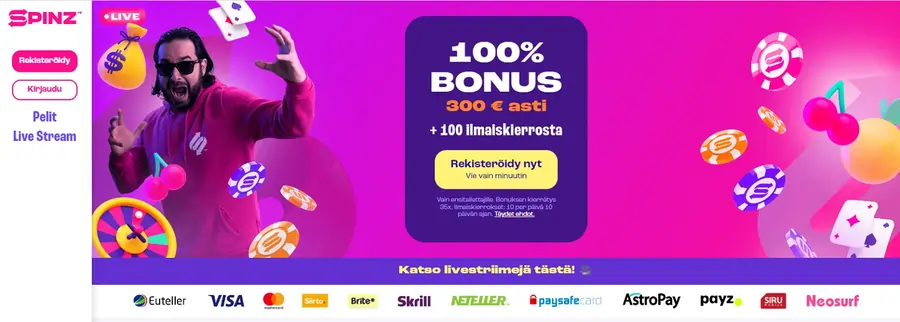 Jos etsit väriä elämään, hyviä tarjouksia sekä haluat samalla nauttia kasinopelaamisesta, on siihen hyvä vaihtoehto ehdottomasti Spinz Casino. Sen verran sinun pitää vaivautua, että teet nopean rekisteröitymisen, mutta vaivanpalkkana sinulle on tarjolla varsin reilusti erilaisia maksutapoja.