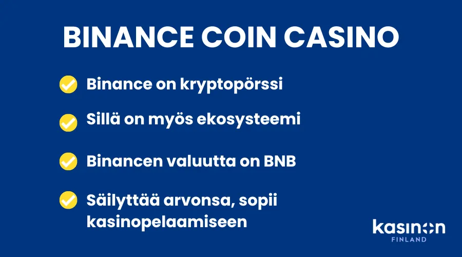 Jos olet ollut jo aiemmin kiinnostunut kryptokasinoista, niin olet varmasti bongannut Binancen tai BNB:n maksutapojen joukosta. Kieltämättä nimenä Binance jonkin verran hämmästyttää, sillä sehän tunnetaan lähinnä siitä, että kyseessä on kryptovaluuttapörssi. Kaiken lisäksi se on varsin tunnettu maailmalla.