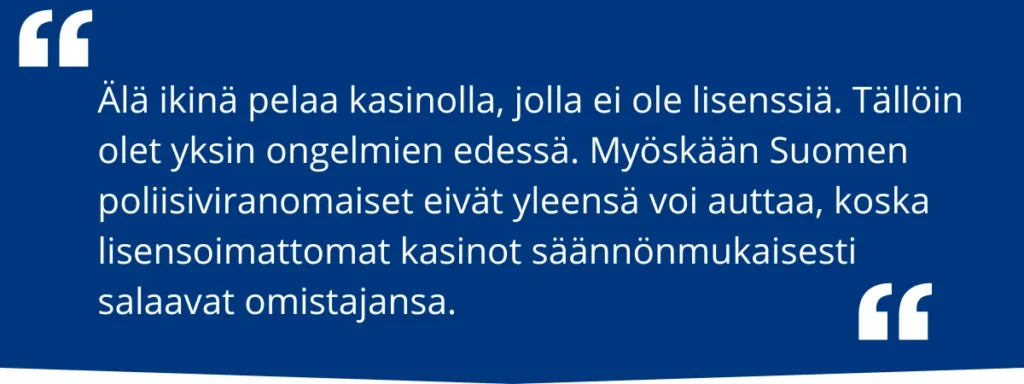 Pelilisenssin alaisuudessa toimivat nettikasinot ovat turvallisempi valinta pelaajille. Jos nettikasino ei vastaa tai toimii epäoikeudenmukaisesti, niin peliviranomainen tulee väliin ratkaisemaan asian. Toisinaan tämäkään ei välttämättä ratkaise tilannetta, mutta asian vakavuudesta riippuen kyseinen peliyritys voi menettää pelilisenssin, eikä voi jatkaa toimintaa entiseen tapaan.