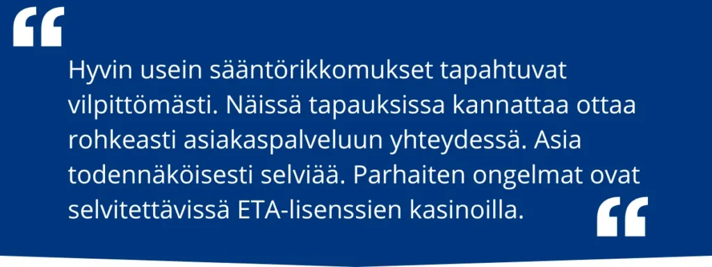 Ratkaisu eston poistoon: Jos olet todistettavasti käyttänyt bonuksia vilpillisesti, niin pelitilin estoa ei ole mahdollista poistaa. Tämän lisäksi saat mitä todennäköisimmin elinikäisen porttikiellon kyseiselle nettikasinolle.