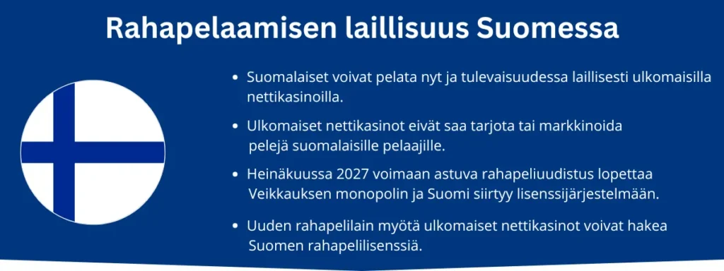 Pelaajana on täysin laillista pelata millä tahansa nettikasinolla. Suomessa ei toistaiseksi ole vielä lisenssiä nettikasinoille, mutta tämä muuttuu vuonna 2027. Tuolloin nettikasinot voivat hakea Suomen lisenssiä ja markkinoida tuotteitaan suomalaisille pelaajille. Uudessa lisenssijärjestelmässäkin, pelaajana sinulla on laillinen oikeus rekisteröityä, pelata ja nostaa voittoja miltä tahansa sinut pelaajaksi hyväksyvältä nettikasinolta.