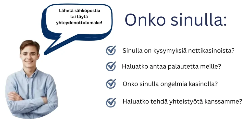 Toisinaan sinulle voi tulla ongelmia kasinolla, jolloin voittaa meihin rohkeasti ja luottamuksellisesti yhteyttä. Autamme sinua asioiden selvittelyssä. Vai haluatko tehdä yhteistyötä kanssamme, esimerkiksi saada kasinon listattua sivuillemme? Näissä kaikissa asioissa voit lähettää meille sähköpostia, tai täyttää yhteydenottolomakkeen!