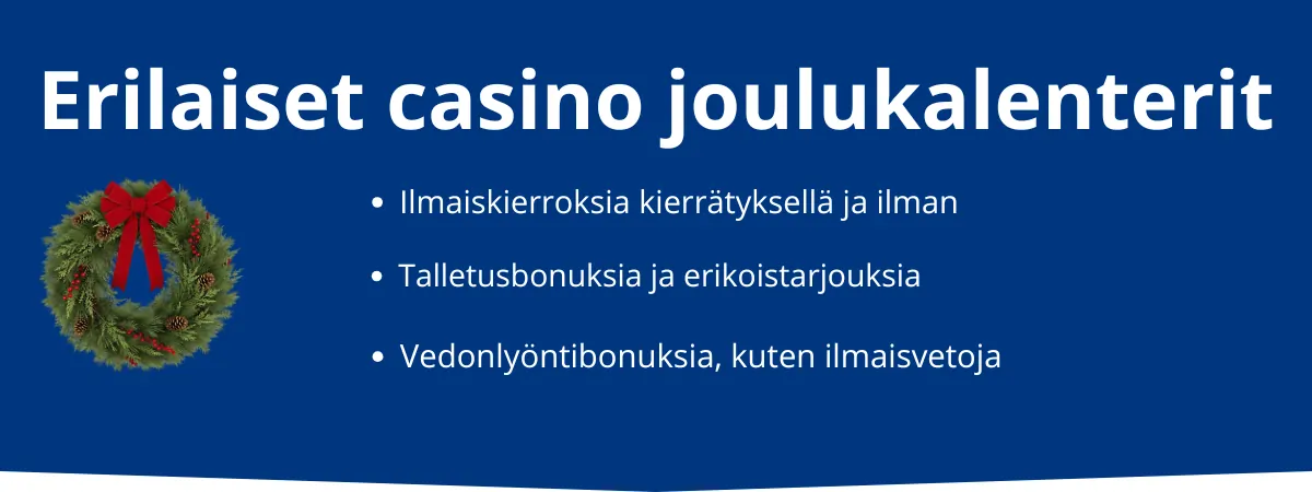 - Vertaile kasinoiden joulukalentereita: Tutustu minkälaisia joulukalentereita löytyy ja vertaile niiden sisältöä sekä mitä sääntöjä ja ehtoja on liitetty etuihin.