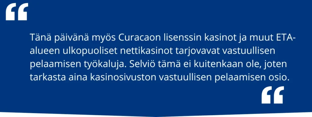 Kaikki Maltan ja Viron lisenssin omaavat suomalaiset nettikasinot tarjoavat pelaamisen hallintatyökaluja, joista myös näiden EU-maiden lainsäädännössä säädetään. ETA-alueen ulkopuolisilla nettikasinoilla tarjonta riippuu täysin operaattorista. Suomikasinoilla yleisempia vastuullisen pelaamisen työkaluja ovat: