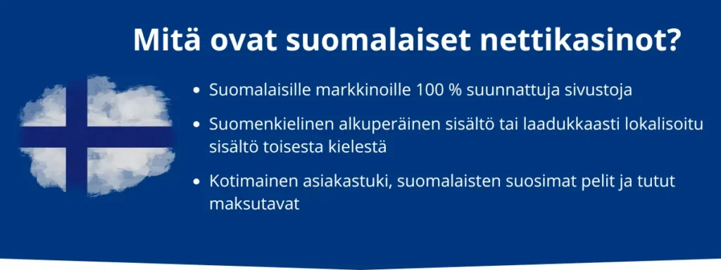 Suomalaiset nettikasinot ovat Suomen markkinoilla toimivia ja suomalaisille suunnattuja nettikasinoita, jotka toimivat yleisimmin Maltan, Viron ja Curacaon lisensseillä.