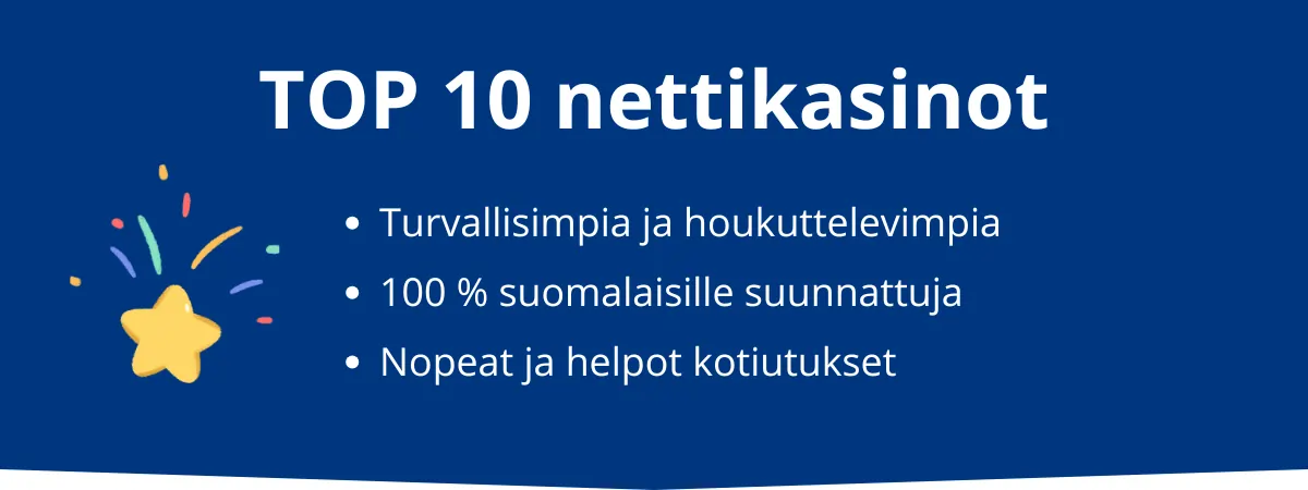 TOP 10 nettikasinot kuulostaa houkuttavalta ja samaan aikaan voi miettiä sitä, mikä niistä olisi kaikkein paras vaihtoehto itselle. Näillä sivuilla esittelemme tämän hetken TOP kasinot suomalaisille pelaajille. Lisäksi kerromme kuinka valitsemme tälle ja muille sivuillemme TOP 10 nettikasinot.